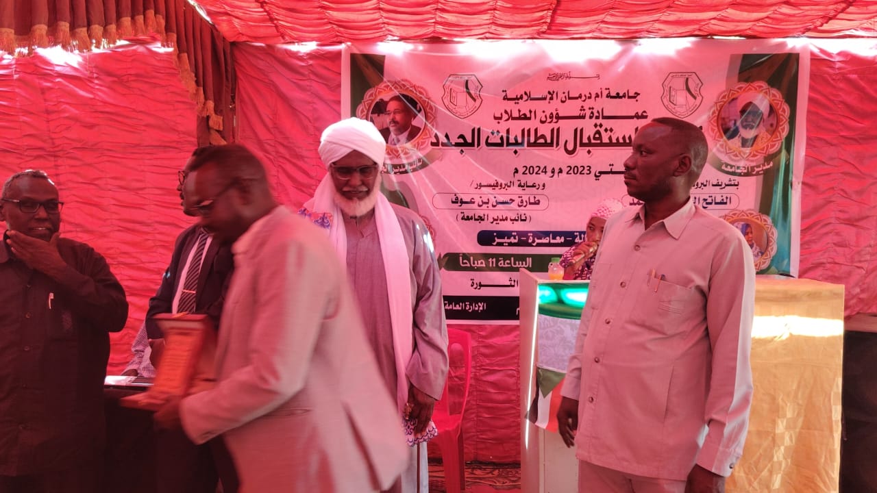 أقامت عمادة شؤون الطلاب بجامعة أم درمان الإسلامية اليوم الاثنين ١٦ فبراير ٢٠٢٦م مهرجان استقبال الطالبات الجدد بتشريف البروفيسور الفاتح الحبر عمر أحمد مدير الجامعة ورعاية البروفيسور طارق حسن ابن عوف نائب مدير الجامعة وحضور عمداء الكليات ومديري الإدارات العامة وعدد من الأساتذة والإداريين. وذلك بمركز الطالبات بالثورة.